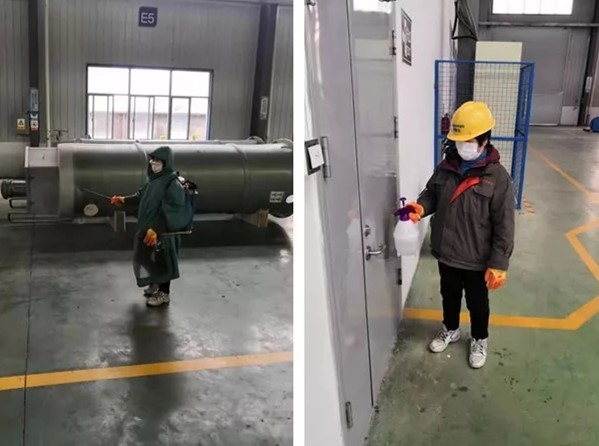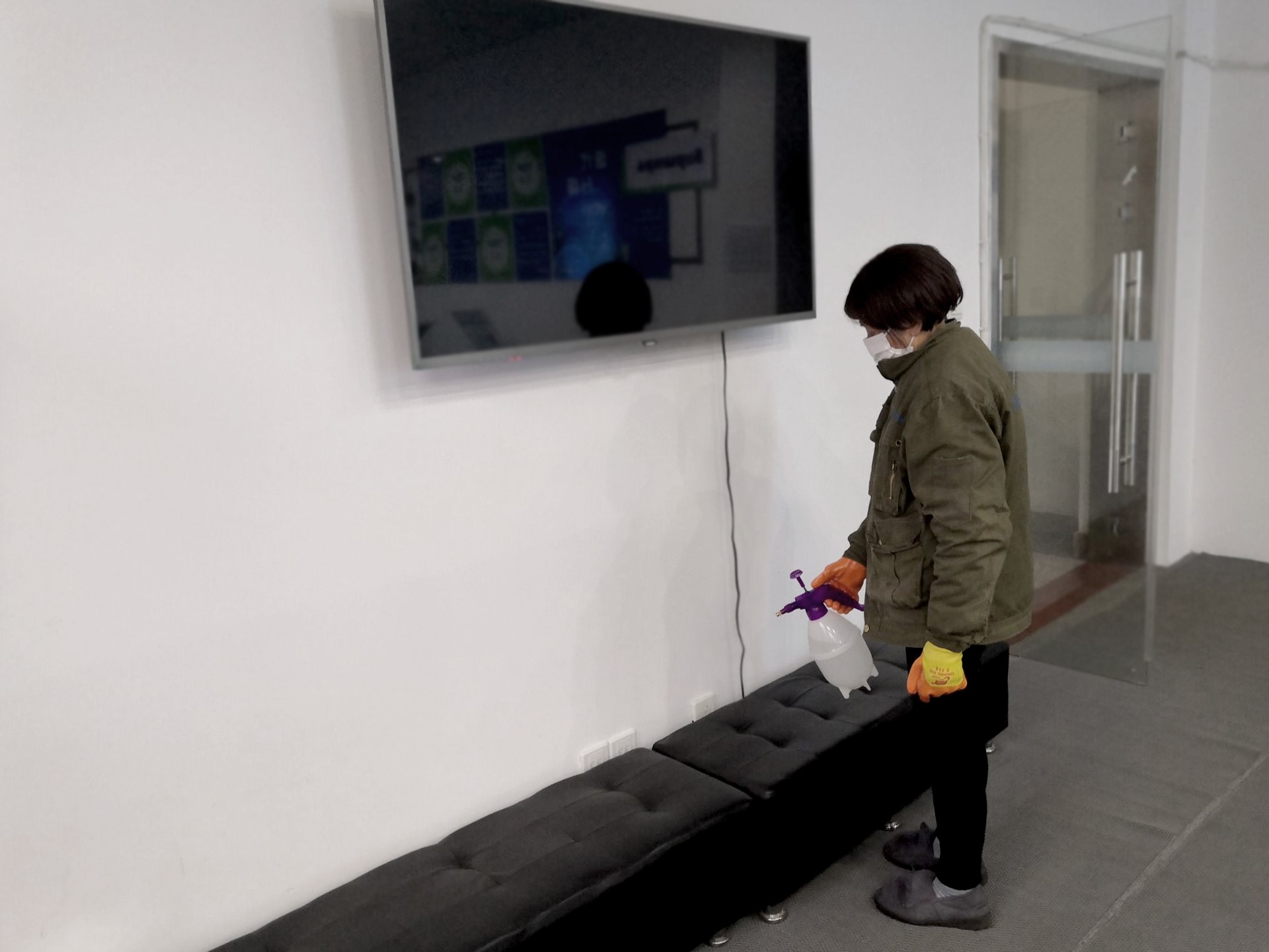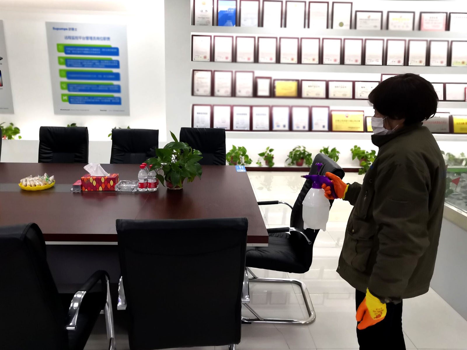客户考察时间约在下午的2点,当天上午9点,负责工厂考察接待的工作人员已经开始安排全面的消毒工作,按照整个工厂考察的流程,从进入工厂大门开始的每一个参观点,包括会议室、云平台监控室、展厅以及车间都进行了细致的消毒。▼