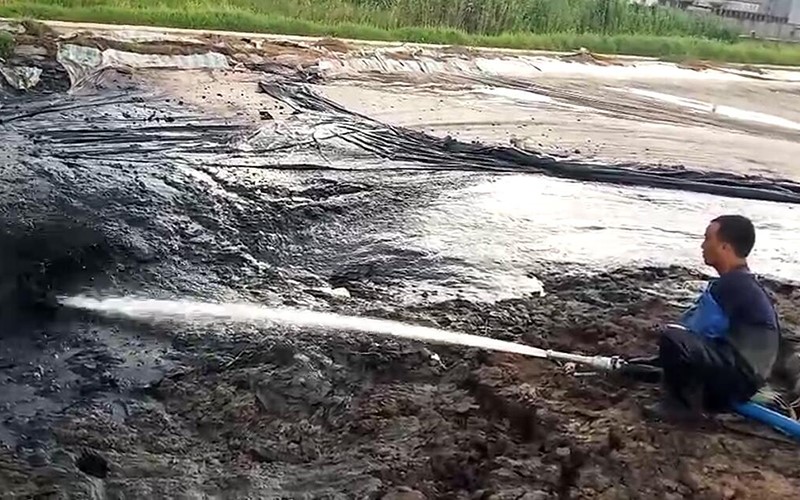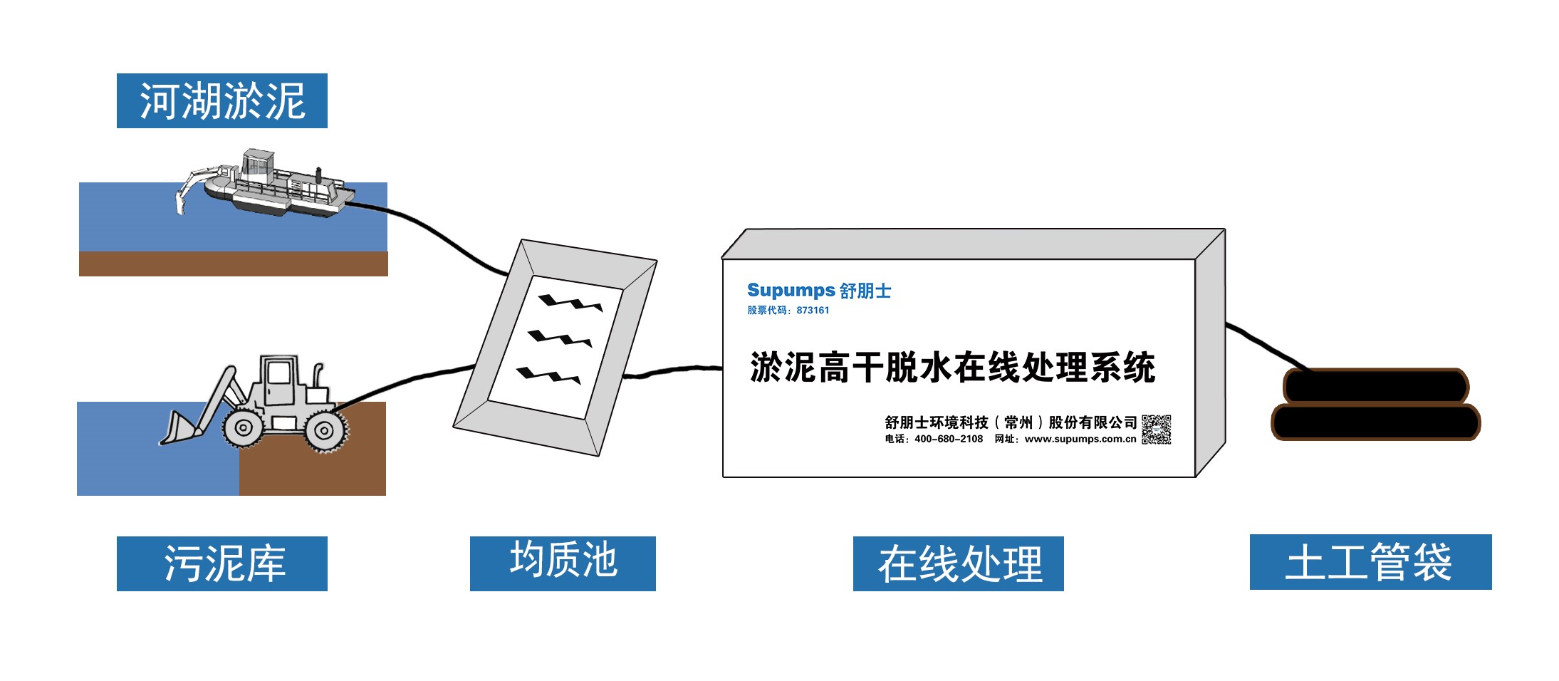 通过绞吸船或泥浆泵抽吸淤泥,再通过管道输送至均质池过滤垃圾后,进入在线处理设备,进行预处理后,输送至土工管袋。
