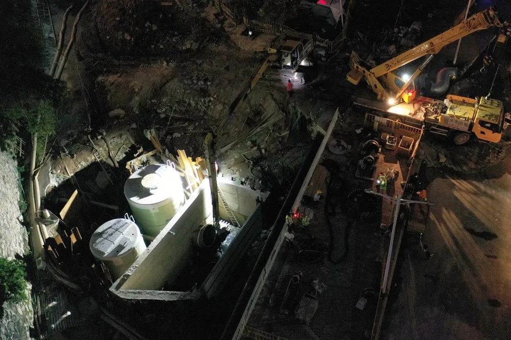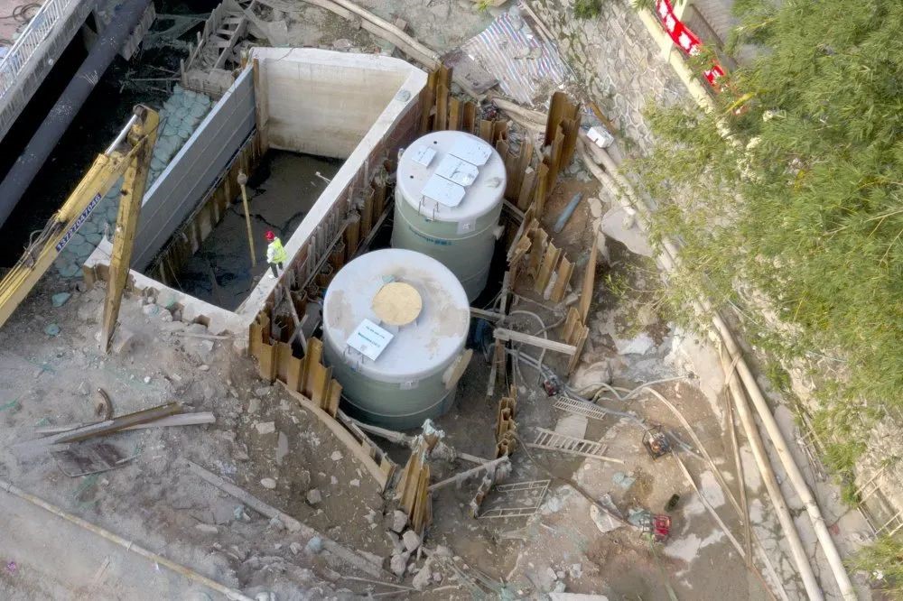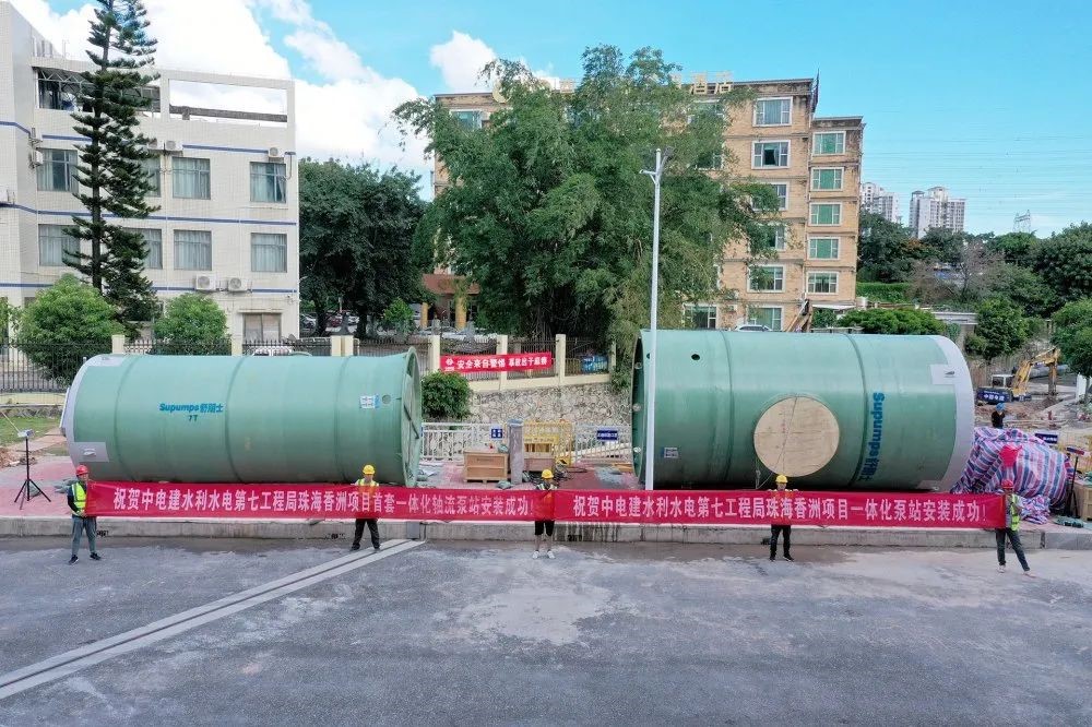 双筒并联,一体化轴流泵站直径3.8m,一体化预制泵站直径3m,筒高均为7.42m。晴天设计规模326m³/h,雨天设计规模1.5m³/s。
