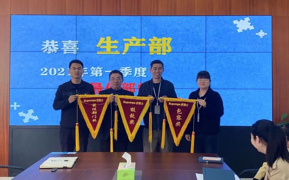 下午由各职能部门对一季度工作完成情况进行汇报。最后由产品组对2021年新品政策进行宣导与讨论。会后对一季度表现优异的部门进行颁奖表彰。