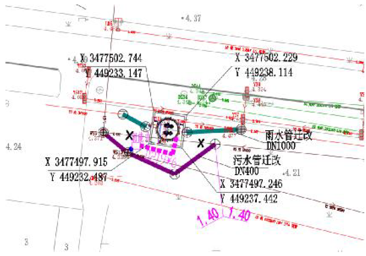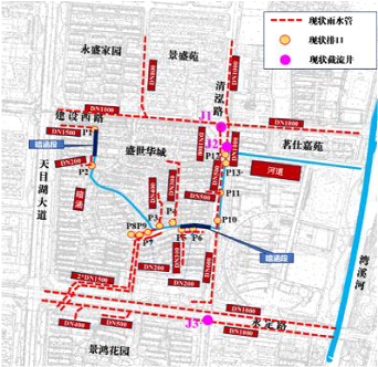 J3:主要截流永定路DN1000下河雨水管内混接污水,关联上游片区主要为景泓花园。由于现状DN1000距离道路较近,需对雨水管道进行移位,同步对南侧DN400污水管道进行移位迁改。