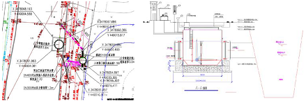 图:J4旋转堰阀门井剖面、截流井平面布置图