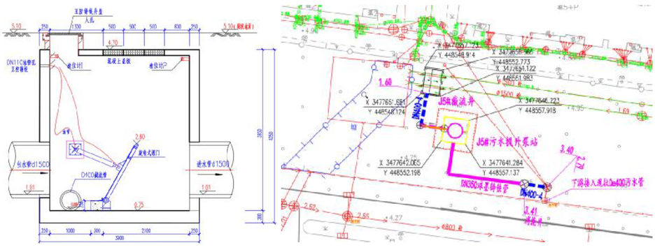 P8P9上游为两根并列的d1500 雨水管道,本工程新建旋转堰阀门井将污水截流至J5智能截留井内。